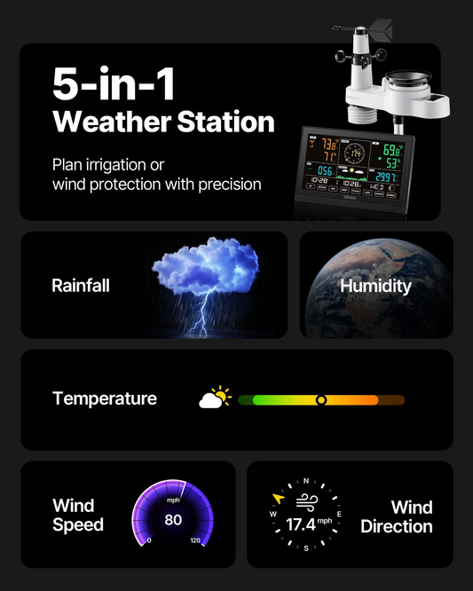 5-in-1 Wireless Weather Station 7.5 in Display Indoor Outdoor Thermometer Sensor