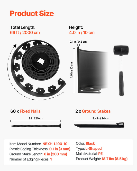 VEVOR Landscape Edging 66ft x 4in L-Shaped Durable Plastic Garden Border No Dig