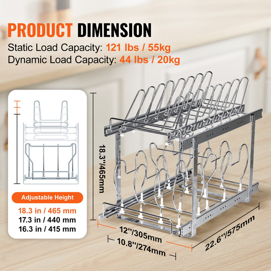 VEVOR Pan and Pot Rack, 2-Tier Expandable Pull Out Under Cabinet Organizer, Cookie Sheet Baking Pans Tray Racks, Adjustable Wire Dividers, Steel Lid Holder for Kitchen Cabinet & Pantry Storage, 12"W