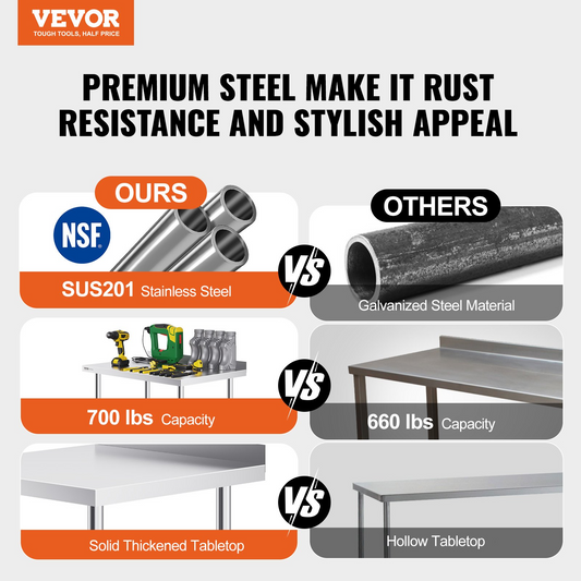 VEVOR 24 x 72 x 36 Inch Stainless Steel Work Table, Commercial Food Prep Worktable Heavy Duty Prep Worktable, Metal Work Table with Adjustable Height for Restaurant, Home and Hotel