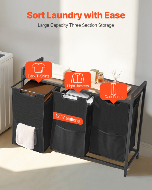 VEVOR 3 Section Laundry Sorter with Pull-Out Bags Metal Frame & Wooden Tabletop