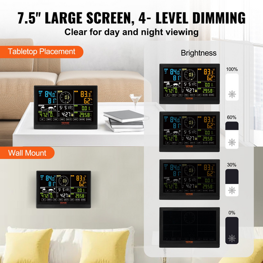 VEVOR 7-in-1 Wi-Fi Weather Station, 7.5 in Color Display, Home Weather Station Indoor Outdoor, with Solar Wireless Outdoor Sensor Alarm Alerts, for Temperature Humidity Wind Speed/Direction Rain