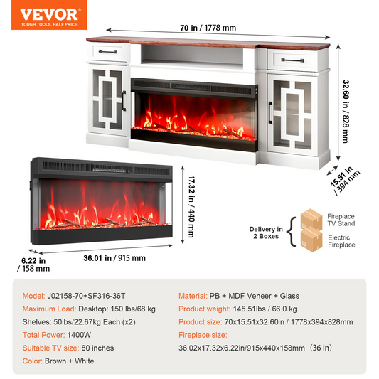 VEVOR 80 in Fireplace TV Stand 20 LED Lights Remote Control & Timer Brown+White