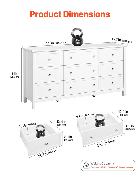 VEVOR 9 Drawer Dresser, Wooden Chest of Drawers with Sliding and Anti-tip Device, Retro Minimalist Dresser Chest, Closet Storage TV Stand Organizer for Living Room, Hallway, Bedroom, Entryway, White