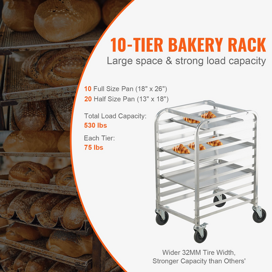 VEVOR Bun Pan Rack, 10-Tier Commercial Bakery Racks with Brake Wheels, Aluminum Racking Trolley Storage for Half & Full Sheet, Speed Rack For Kitchen Home, Bread Baking Equipment, 26"L x 20.3"W x 39"H