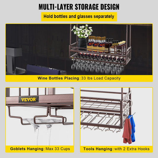 VEVOR Ceiling Wine Glass Rack, 46.9 x 11.8 inch Hanging Wine Glass Rack, 18.9-35.8 inch Height Adjustable Hanging Wine Rack Cabinet, Coppery Wall-Mounted Wine Glass Rack Perfect for Bar Cafe Kitchen