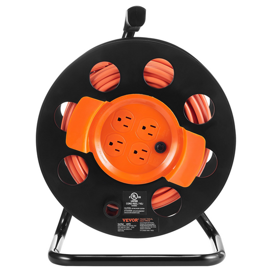 VEVOR Extension Cord Reel, 100FT, with 4 Outlets and Dust Cover, Heavy Duty 12AWG SJTOW Power Cord, Manual Cord Reel with Portable Handle Circuit Breaker, for Toolshed Garage, Tested to UL Standards