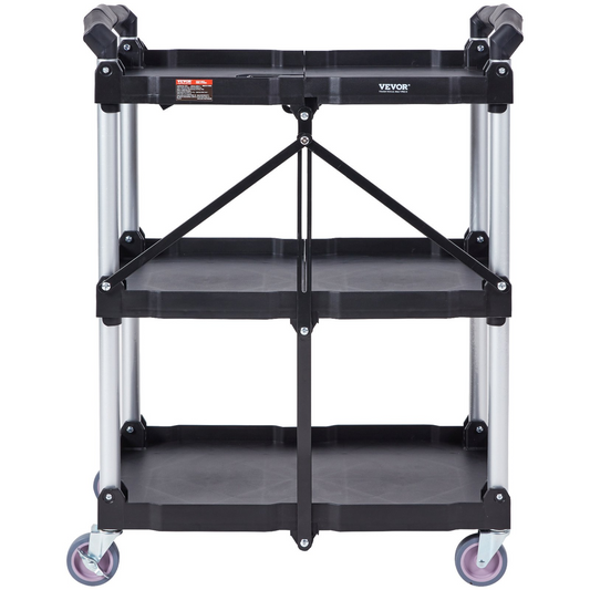 VEVOR Foldable Utility Service Cart, 3 Shelf 165LBS Heavy Duty Plastic Rolling Cart with Lockable Wheels, Ergonomic Handle, Portable Garage Tool Cart for Warehouse/Office/Home(25.62"x15.43"x32.76")