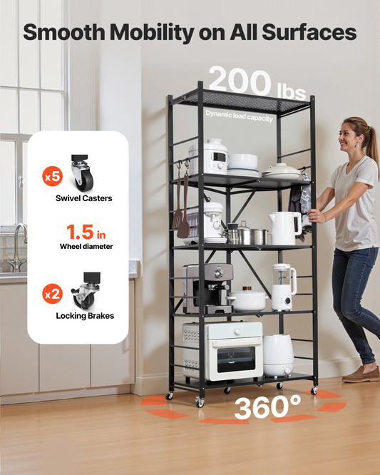 VEVOR Folding Storage Shelf with Wheels 5-Tier No Assembly Organizer Shelf Black
