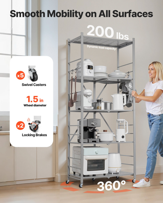 VEVOR Folding Storage Shelf with Wheels 5-Tier No Assembly Organizer Shelf Grey