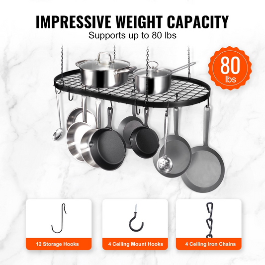 VEVOR Hanging Pot Rack, 32 inch Hanging Pot Rack Ceiling Mount, Ceiling Pot Rack with 12 S Hooks, 80 lbs Loading Weight, Ideal for Home, Restaurant, Kitchen Cookware, Utensils
