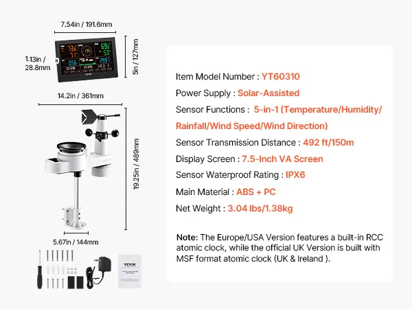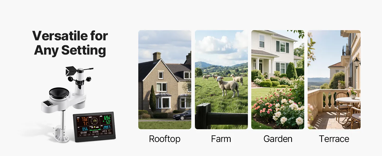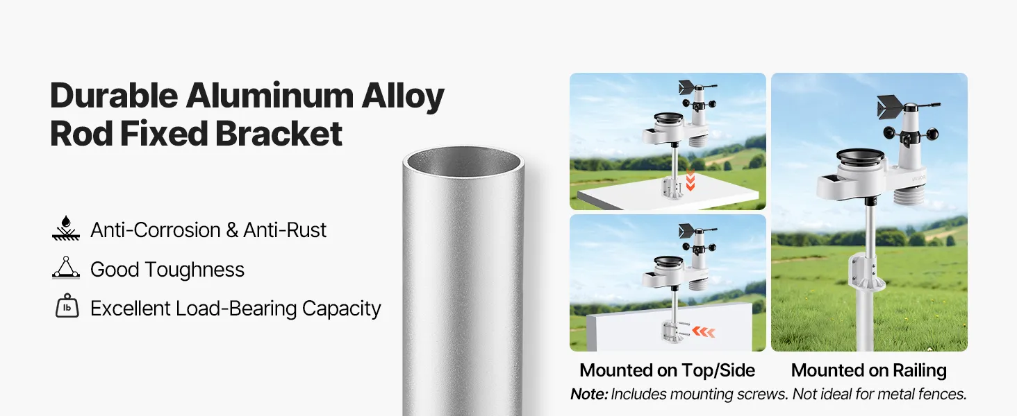 - Solar Powered, Built to Last: High-efficiency solar panels absorb solar energy during the day and charge the battery at night—cutting energy costs. Our digital weather station comes with an aluminum alloy rod fixed bracket for long-term use