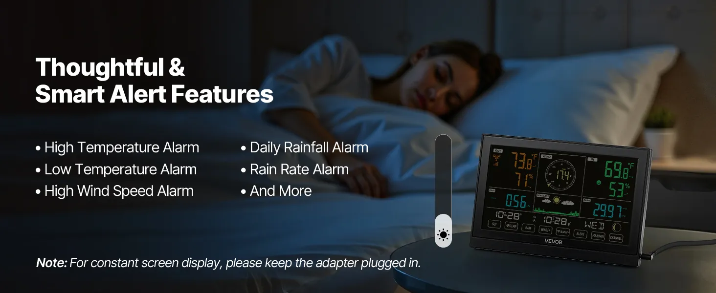 - Smart Alert Functions: Our solar powered weather station features high temperature alarm, low temperature alarm, high wind speed alarm, daily rainfall alarm, rain rate alarm, and more. Get notified in time to safeguard your property and security