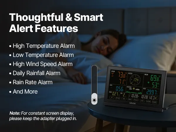 - Smart Alert Functions: Our solar powered weather station features high temperature alarm, low temperature alarm, high wind speed alarm, daily rainfall alarm, rain rate alarm, and more. Get notified in time to safeguard your property and security