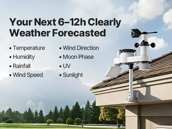 - 7-in-1 Outdoor Sensor: Monitor temperature, humidity, rainfall, wind speed, direction, sunlight, etc—plus dew point, moon phases, and 6-12 hour forecasts. Get weather information you need to plan smarter from home with our wireless weather station