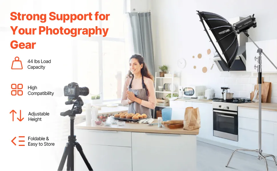 - Compatible with Various Photography Gear: The center column features a universal threaded adapter, ensuring easy installation and compatibility with most photography equipment. Ideal for studio setups, our photography C stand seamlessly supports equipment like video reflectors, softboxes, overhead rigs, and single lights