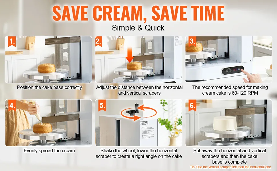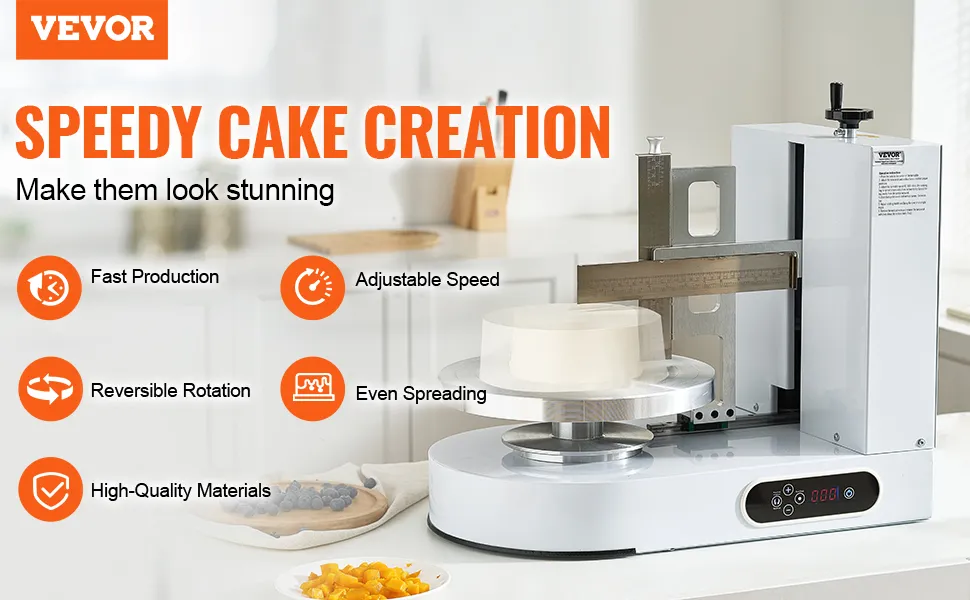 - Simple Operation: Cake frosting machine is ready to use, with one-click start and stop. The speed of turntable is adjustable from 25 to 320 RPM (in increments of 5) and it can rotate both clockwise and counterclockwise. The one-handed control scraper, freely adjustable in height, is highly operable, enabling even beginners to master it quickly!