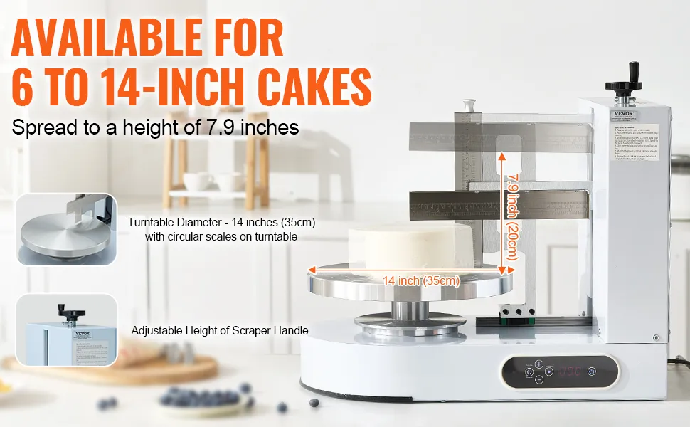 - Quickly Decorating: Our cake decorating machine is suitable for cakes size 6 to 14 inches, and can spread up to 7.9 inches in height. Its 14" (35 cm) turntable with concentric circles offers ample space, so it's easy to pick up the cake, saving raw materials and enhancing work efficiency for baking artists.