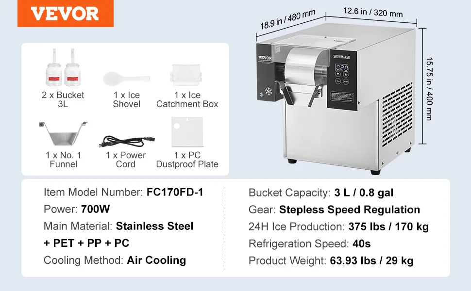 - Efficient, Continuous Ice Production: The commercial snowflake ice machine features a high-performance stable air-cooling system, achieving quick cooling in 40 seconds and producing ice in just 3 seconds after pre-cooling, capable of producing approximately 375 lbs / 170 kg of ice per day, ideal for making various beverages such as sugar drinks, alcoholic drinks with an alcohol content of less than 10°, fruit juice drinks, and milk.