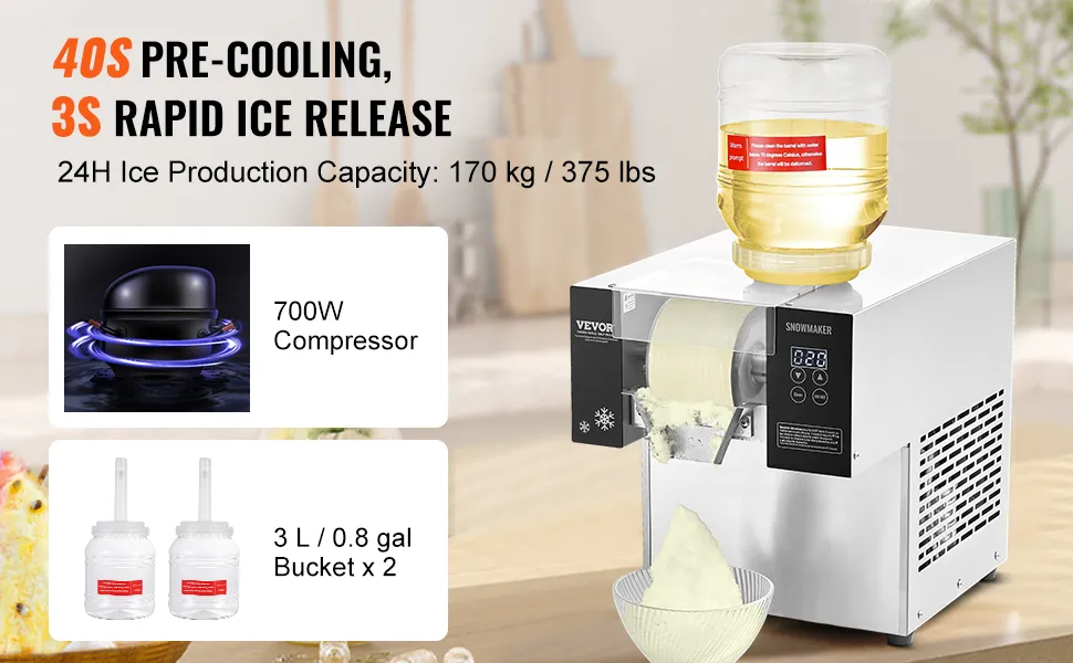 This air-cooled snowflake ice machine features a powerful 700W compressor that achieves rapid cooling within 40 seconds. It boasts two 3 L capacity baskets, capable of producing up to 375 lbs / 170 kg of ice in 24 hours, perfect for creating a variety of milkshake ice creams with different textures.