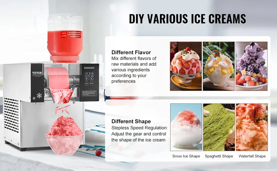 Adjust the settings to create snowflake ice, noodle ice, and other shapes and flavors of ice cream.