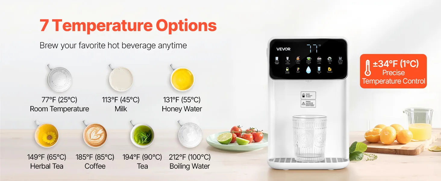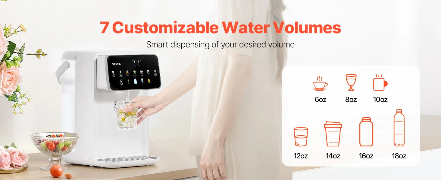 - 7 Temperatures & 7 Water Volumes: This countertop water dispenser offers precise temperature control with 7 preset temperatures (77°F, 113°F, 131°F, 149°F, 185°F, 194°F, 212°F), and 7 water volumes (6oz, 8oz, 10oz, 12oz, 14oz, 16oz, 18oz)