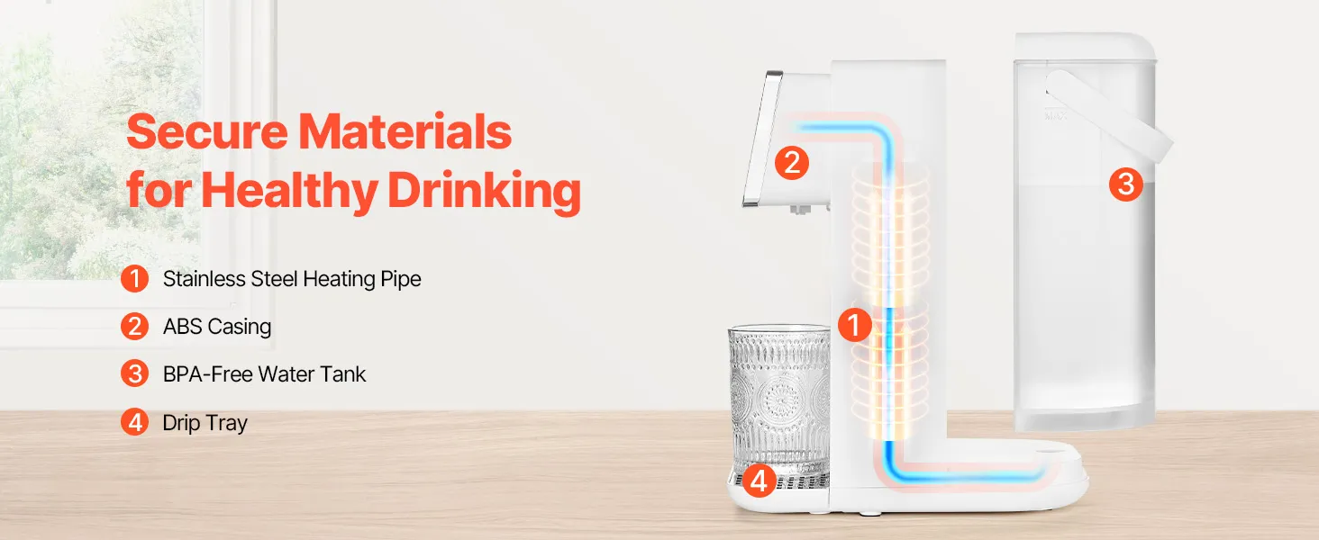 The heating system is made from food-grade stainless steel, while the water tank is crafted from BPA-free ASB material, ensuring clean and secure drinking water for you and your family.