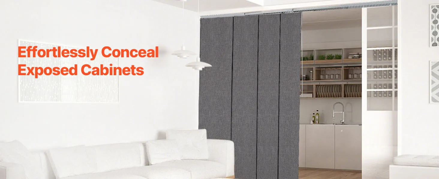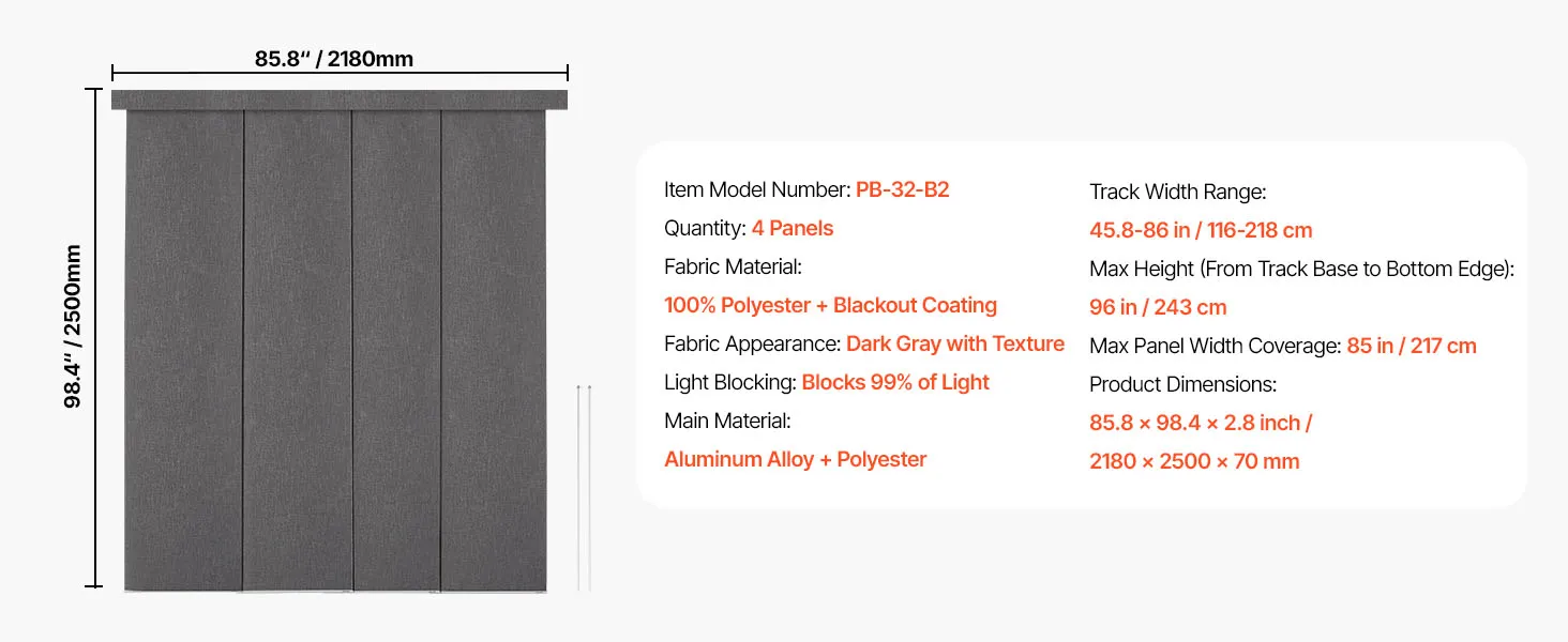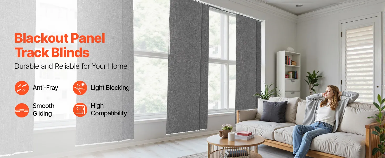 Crafted from durable polyester fabric with a blackout coating, these panel track blinds block 99% of light for privacy. The top valance elegantly hides the track, creating a sleek look. They are ideal for patio doors, large floor-to-ceiling windows, and more, ensuring both style and function.
