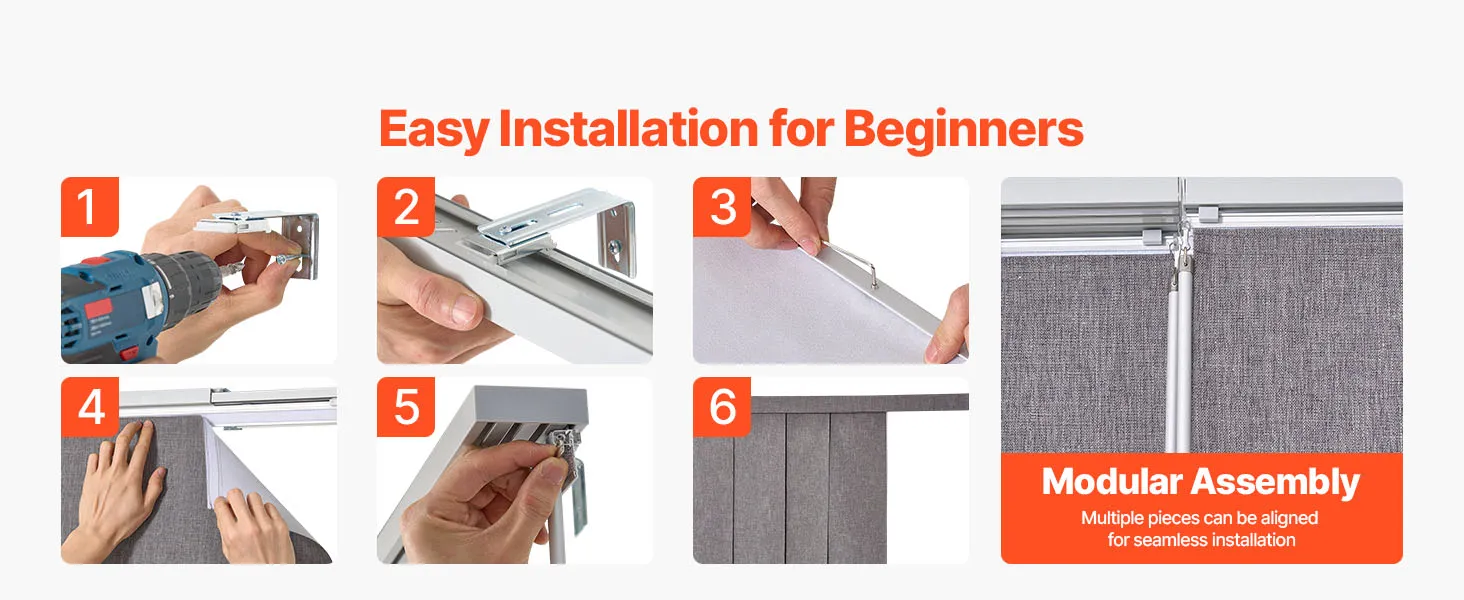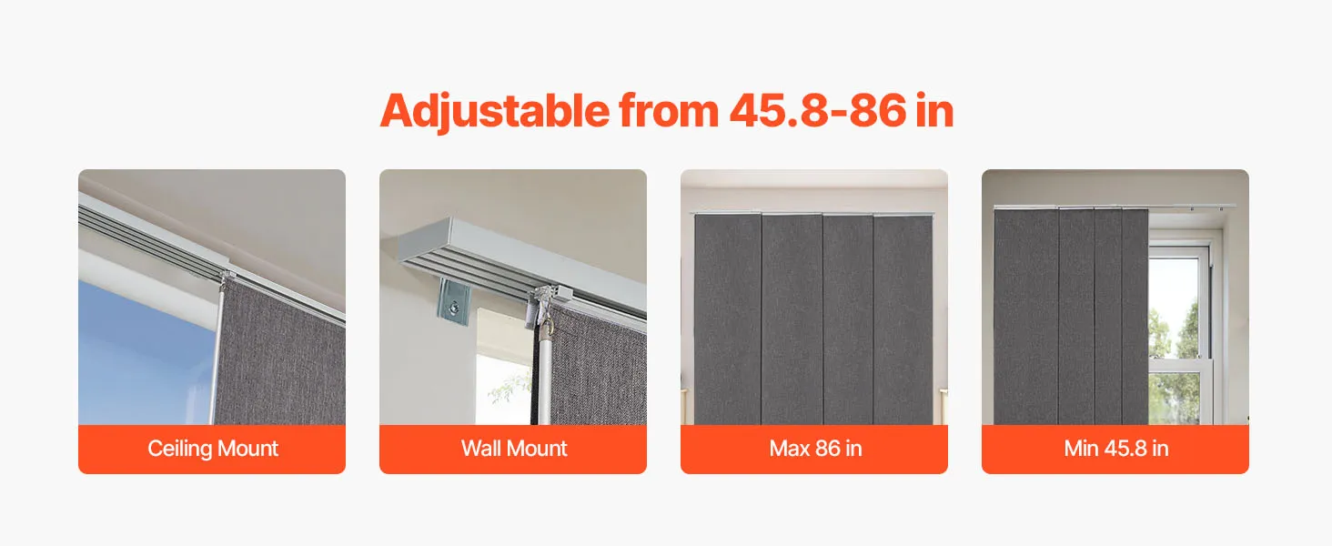 - Flexible Installation: Adjustable track spans 45.8-86 in / 116-218 cm, suitable for ceiling or wall mounting. Easily trim the fabric panels for an ideal fit. When installing multiple sets side by side, the tracks align seamlessly with minimal gaps