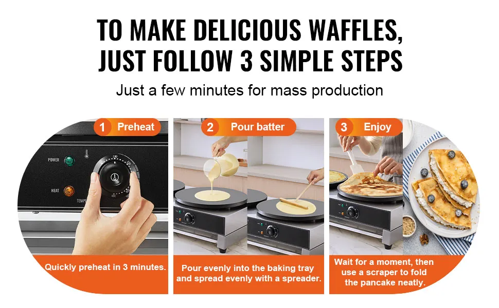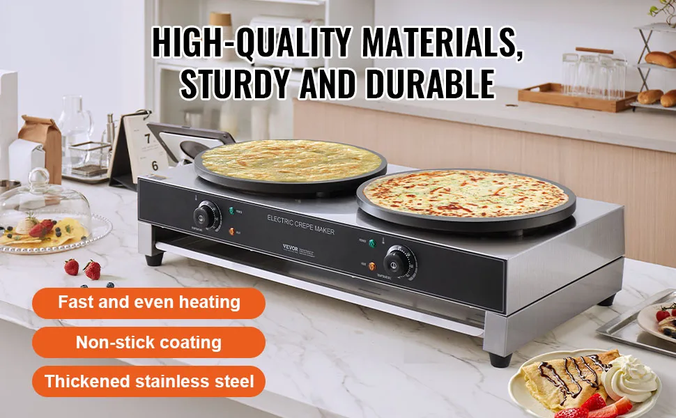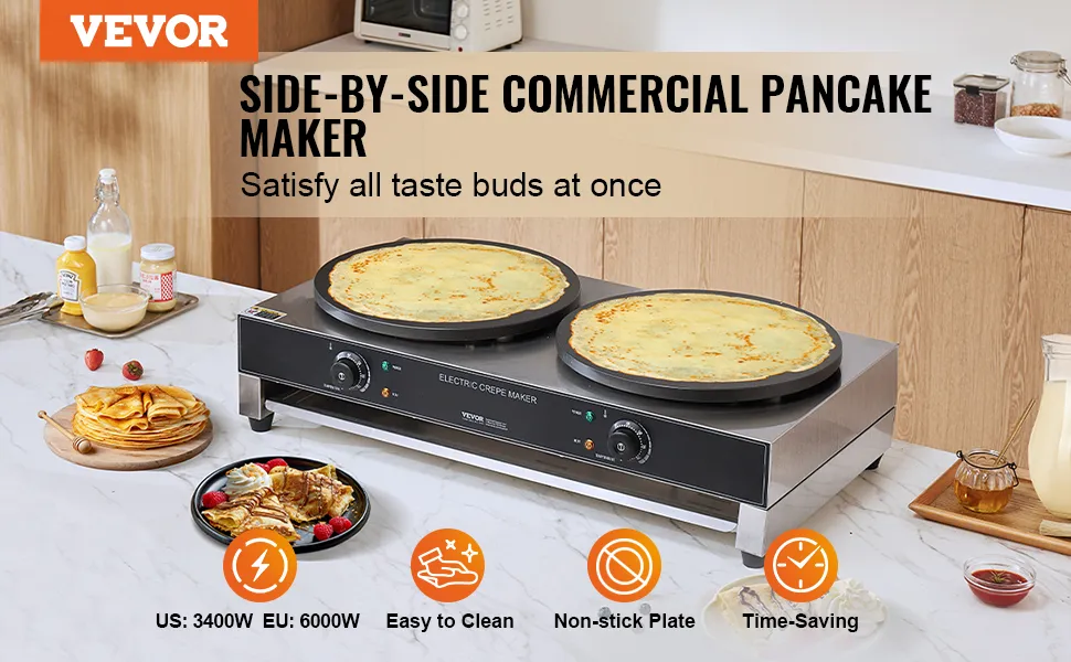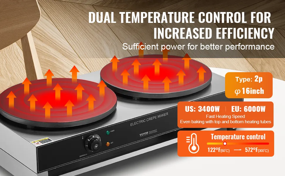 - Quickly Make Delicious Crepes: Our 3400W high-power electric crepe maker features two large 400mm (16-inch) diameter heating plates, making it easy to create delicious waffles and saving you significant time, providing an effortless breakfast experience. Evenly distributed heating elements ensure your waffles are evenly baked. Get ready to enjoy waffles stuffed with your favorite fillings.