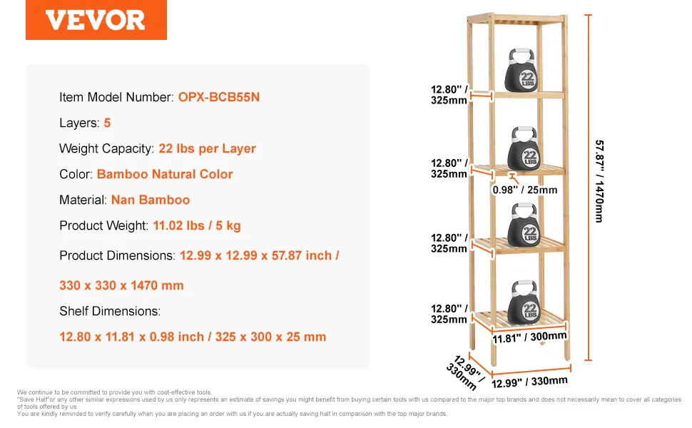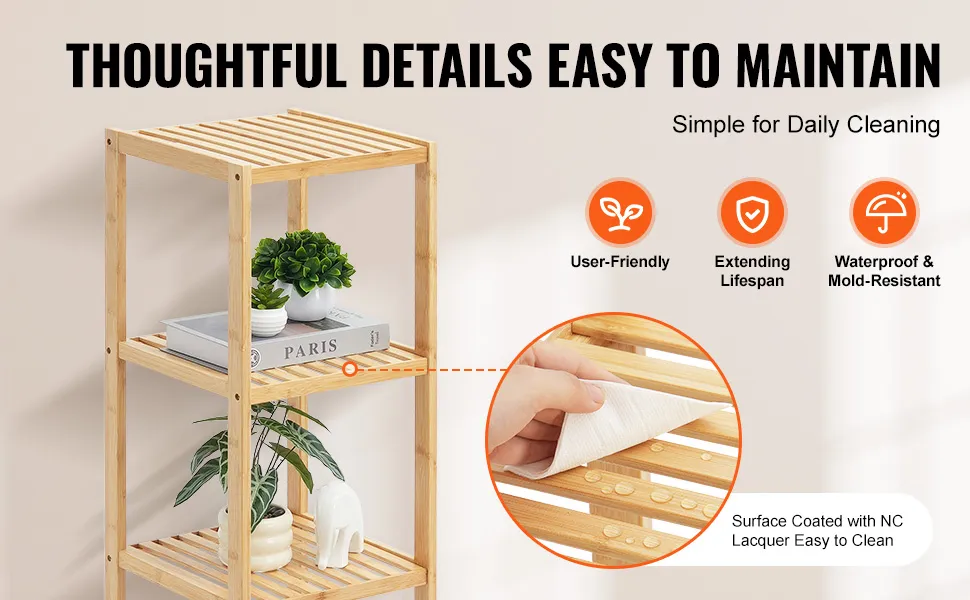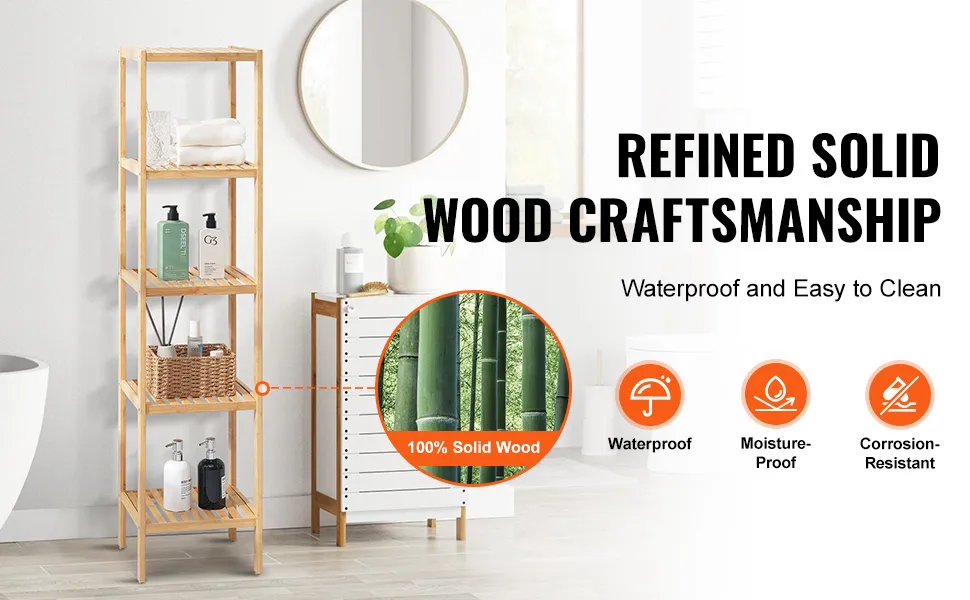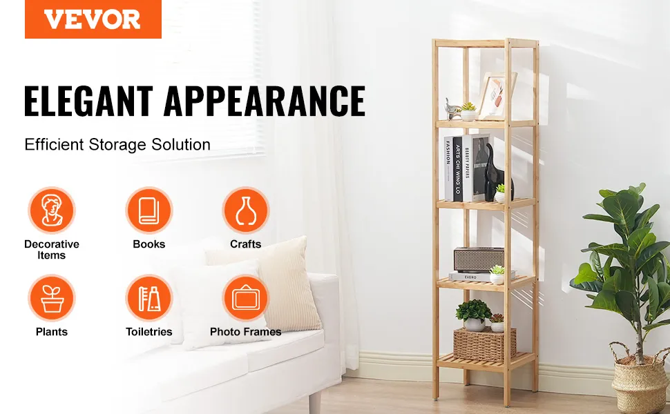 VEVOR 5-Tier Bathroom Standing Shelf, Rattan Shelf, Narrow Shelving Unit, Display Storage Rack Organizer, Freestanding Flower Plant Stand, Multifunctional Bamboo Shelf Ideal for Bathroom, Kitchen, Home, Natural