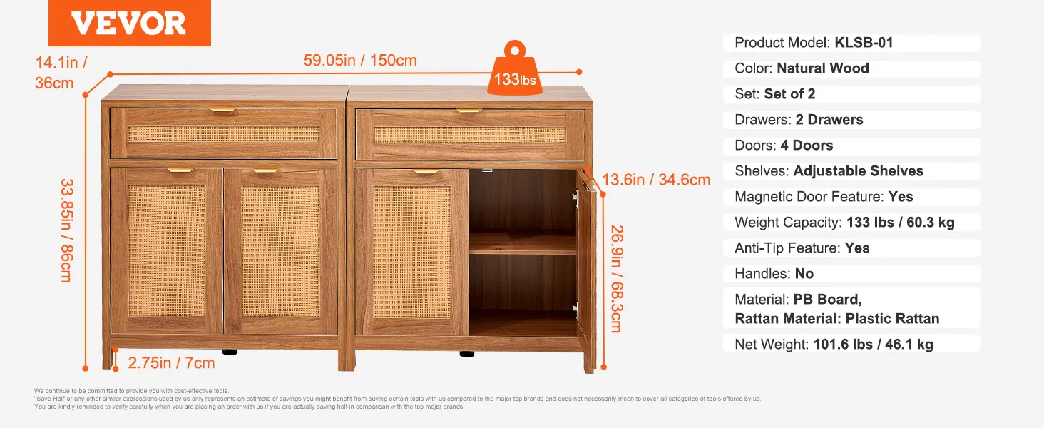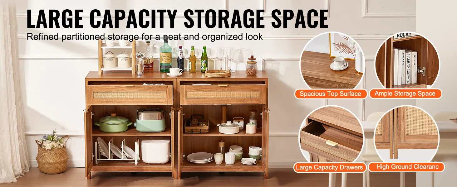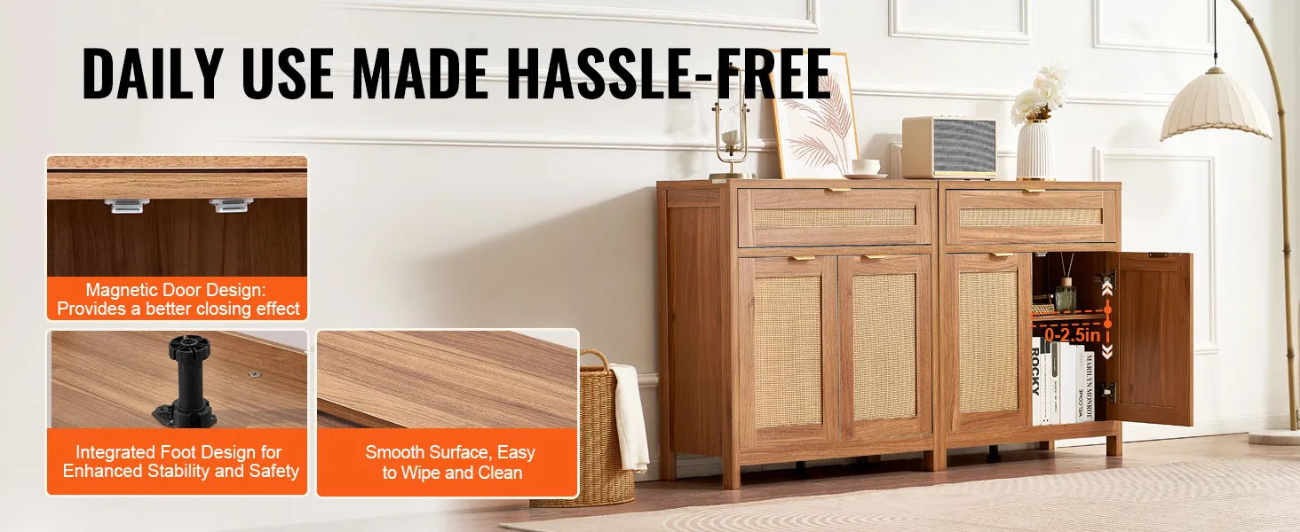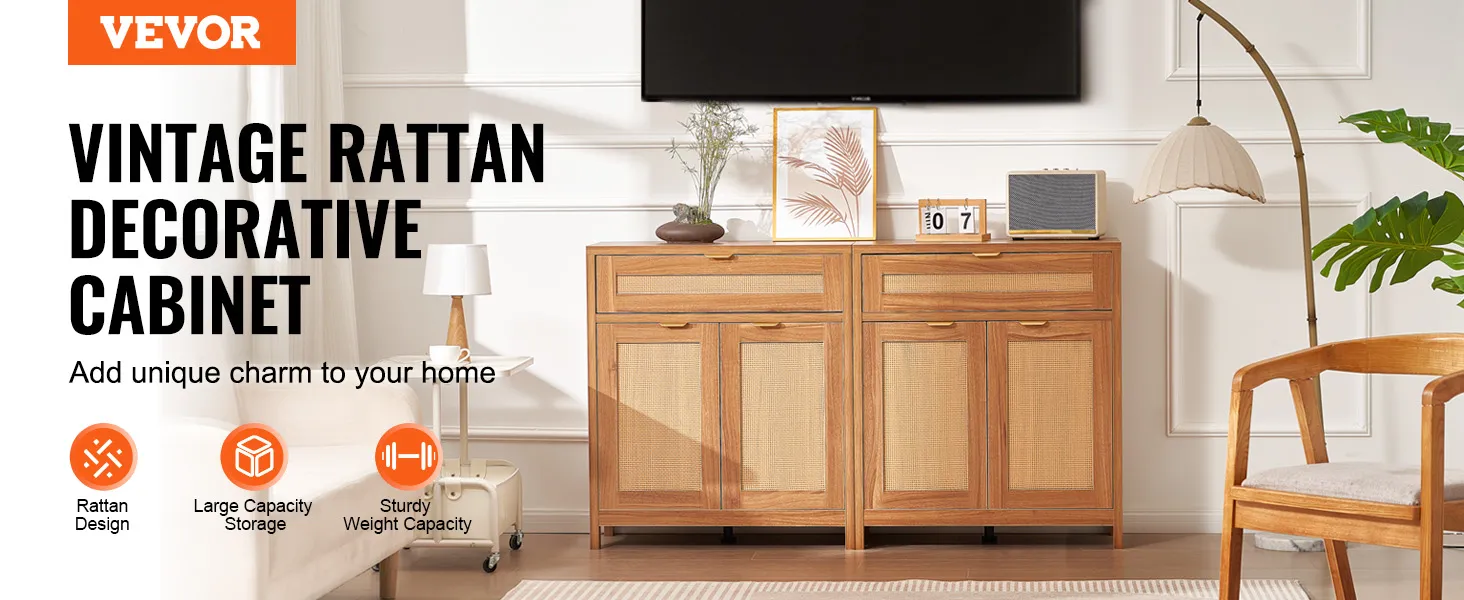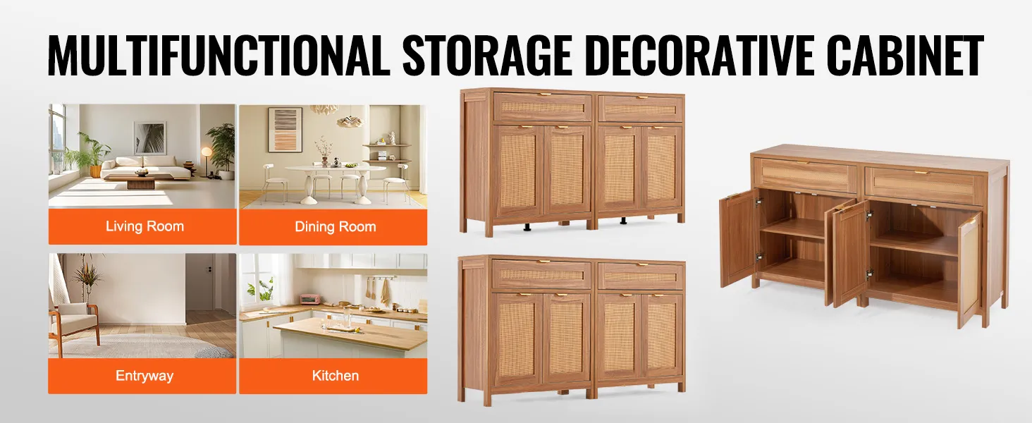 - Versatile Use: This rattan buffet cabinet offers the perfect storage solution while adding style to any room. It can be used as a kitchen sideboard, bar cabinet, storage unit, or entryway shoe cabinet. The friendly materials are safe and easy to clean, making this cabinet suitable for any setting. Note: When assembling, do not use power tools directly.
