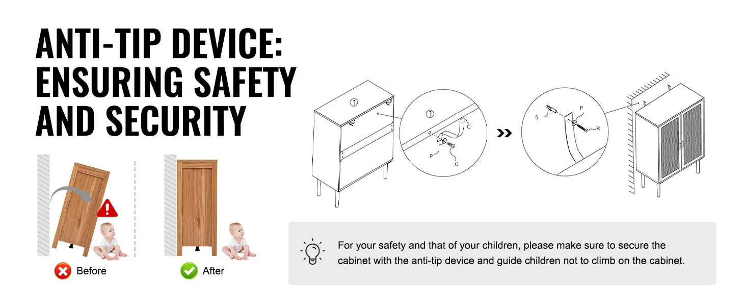Our buffet cabinet features a weight capacity of up to 133 lbs (60.3 kg). An anti-tip kit is included, and it is crucial to install the anti-tip device before use to guarantee enhanced stability and safety.