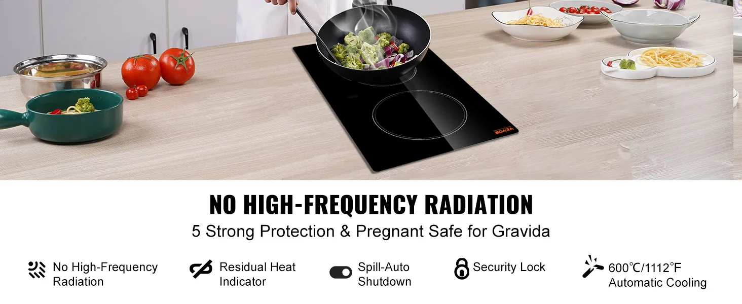 - Multiple Safeguard Functions: This electric stovetop contains various functions for enhanced security. The child security lock avoids accidental touching, while the overheat protection and auto shut-off function keep you from unexpected dangers. No high-frequency radiation allows you to use it with confidence. In addition, when high heat remains on the surface, the residual heat reminder will indicate you, averting hand scald during cleaning. The fan needs to work for a period of time to cool down after the cooker is turned off.