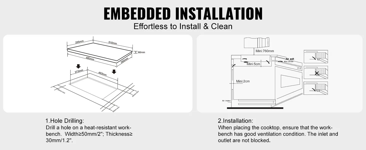 - Built-in Design: With the 10.7x19.4-inch cutout size, this 11.6x20 inch cooktop adopts a built-in design, convenient for you to install and saves your kitchen space. Suitable for voltages of 110-127V, 50/60Hz. NOTE: The power plug is a US Plug (UL 1026), please confirm if the socket matches before purchasing.