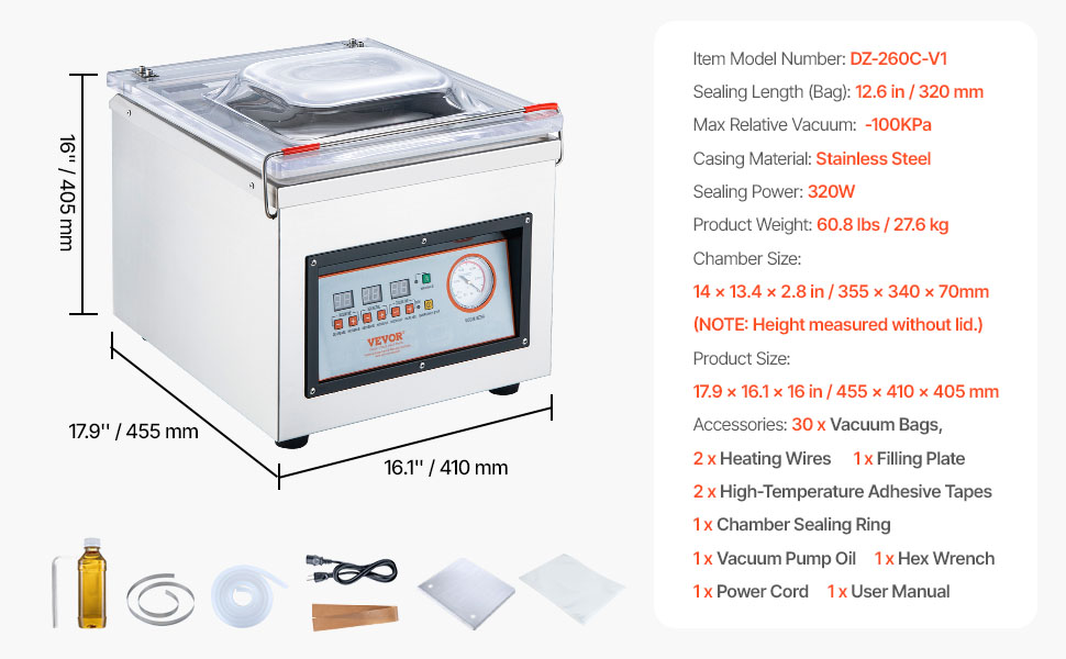 VEVOR Chamber Vacuum Sealer DZ-260C Kitchen Food Chamber Vacuum Sealer, 110V Packaging Machine Sealer for Food Saver, Home, Commercial Using