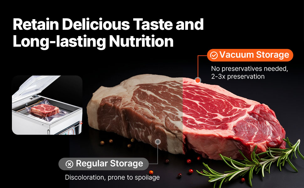 Our vacuum chamber machine boasts a convenient one-touch freshness lock to preserve the flavor, color, and aroma of your food effortlessly. With a strong suction power of 100KPa, it seals in freshness perfectly. Keep track of your progress with clear displays for vacuuming and sealing times.
