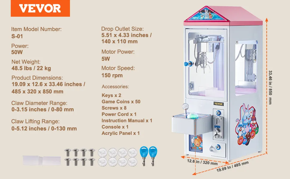 This claw machine boasts a precision steel claw with adjustable grip strength for easy handling of dolls of all sizes. The responsive joystick and clear control panel allow for precise direction and force control, boosting success rates. Enjoy immersive fun with the VEVOR claw machine immediately!