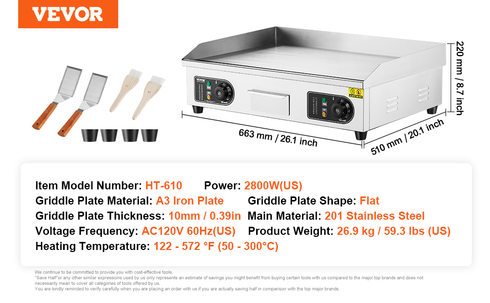 The VEVOR countertop flat-top grill has a large cooking surface. It measures 25.98 x 15.75 inches. The non-stick surface allows for easy cooking. Cook multiple dishes simultaneously. This is perfect for busy kitchens. Cast iron is durable and efficient. It ensures that your food slides off easily. You can make pancakes, bacon, and more. Large surface area meets high-volume demands. Therefore, it is perfect for use in both restaurants and at home. Enjoy an irritation-free cooking experience. Non-stick makes cleanup simple. This spacious griddle is a game-changer. Elevate your cooking with this efficient tool.