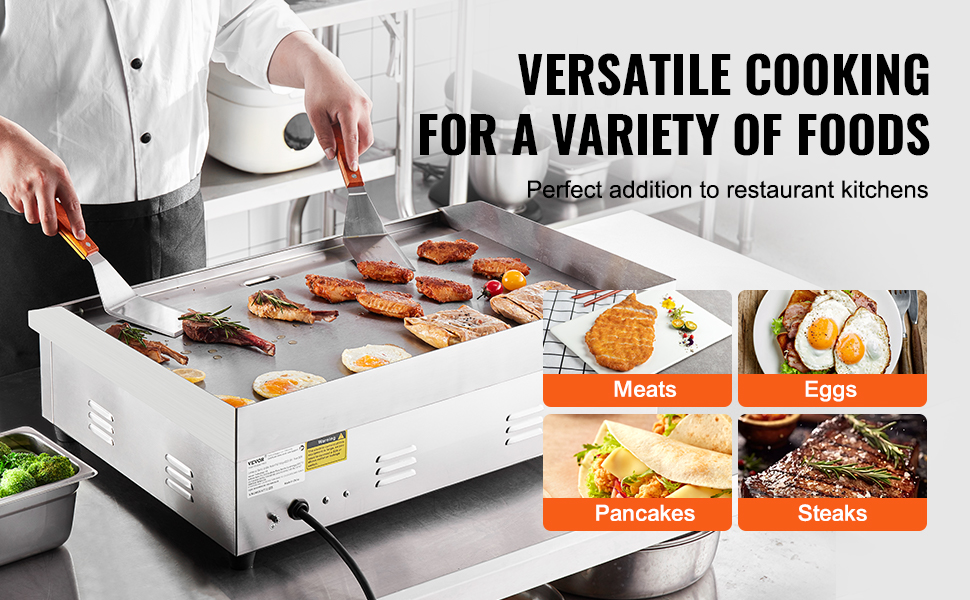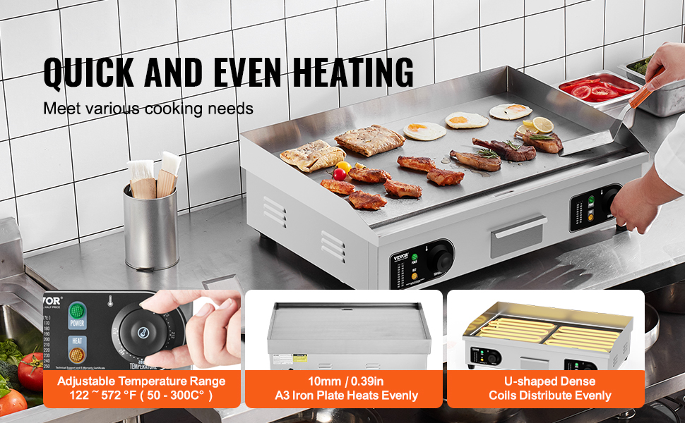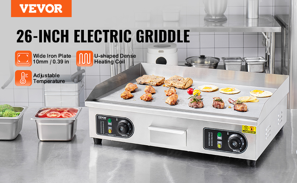 The VEVOR countertop flat-top grill is versatile. You can use it in both home and commercial settings. Use it in restaurants, shops, or at home. You can meet various cooking needs. The griddle is perfect for cooking different dishes. Cook pancakes, bacon, grilled cheese, and more. This makes it an ideal addition to any kitchen. Your griddle has the perfect design that fits into different cooking environments. No matter if you're using it for home or commercial purposes, it works well. So, its versatility makes this tool a valuable asset. Get and utilize this multi-purpose cooking companion. We have got it perfectly for any cooking scenario. Our griddle offers consistent and reliable performance.