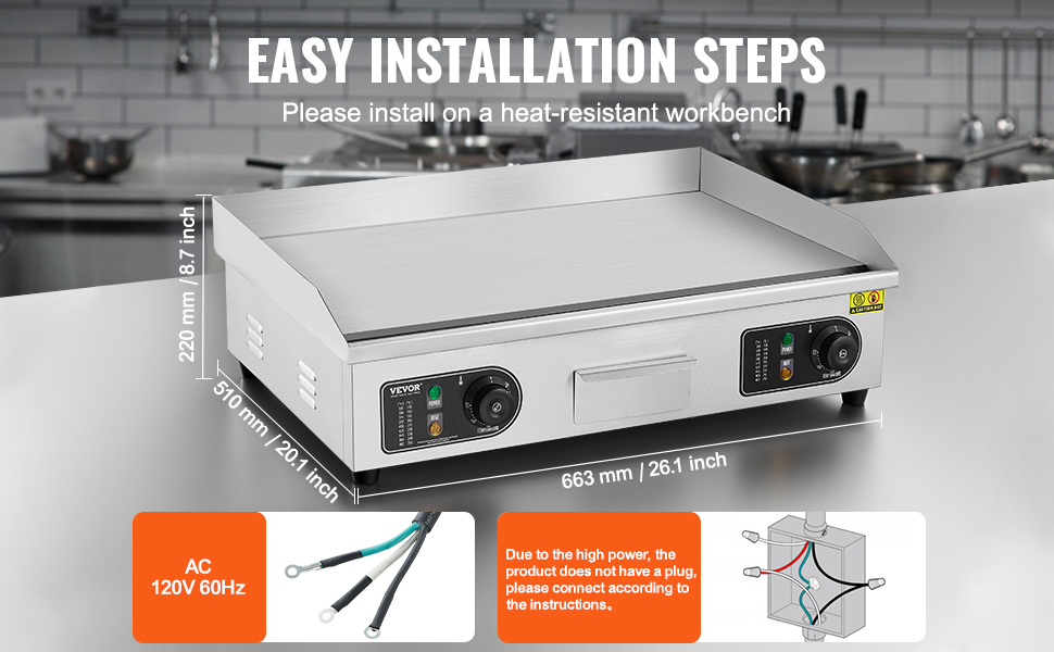 - Even Heating: The commercial electric griddle features an upgraded thickened 10mm / 0.39in iron cooking plate. The U-shaped dense heating tubes are evenly distributed, ensuring uniform temperature across the entire grill. The high-power setting allows for rapid heating of food. NOTE: To prevent circuit breakage, this griddle is compatible with Single-Pole Circuit Breaker (>30Amp).