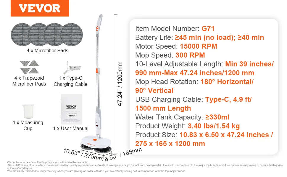 The VEVOR cordless electric mop makes floor cleaning simple and efficient. Its dual spinning mop heads cover more area, ensuring thorough cleaning in every pass. The mop is ideal for various surfaces like hardwood, tile, and bathroom floors. The mop features a lightweight and adjustable handle that allows you to maneuver around furniture. On one charge, a long battery life allows for up to 70 minutes of cleaning. So, it's perfect for cleaning multiple rooms without interruptions. The included microfiber and scrubber pads cater to various cleaning requirements, ensuring your floors remain immaculate. The mop is simple to assemble and operate, making it a convenient addition to your cleaning tools. You can use the mopping easily as well. With its compact design, storage fits perfectly in your cleaning closet. Experience the ease and efficiency of cleaning with the VEVOR cordless electric mop.