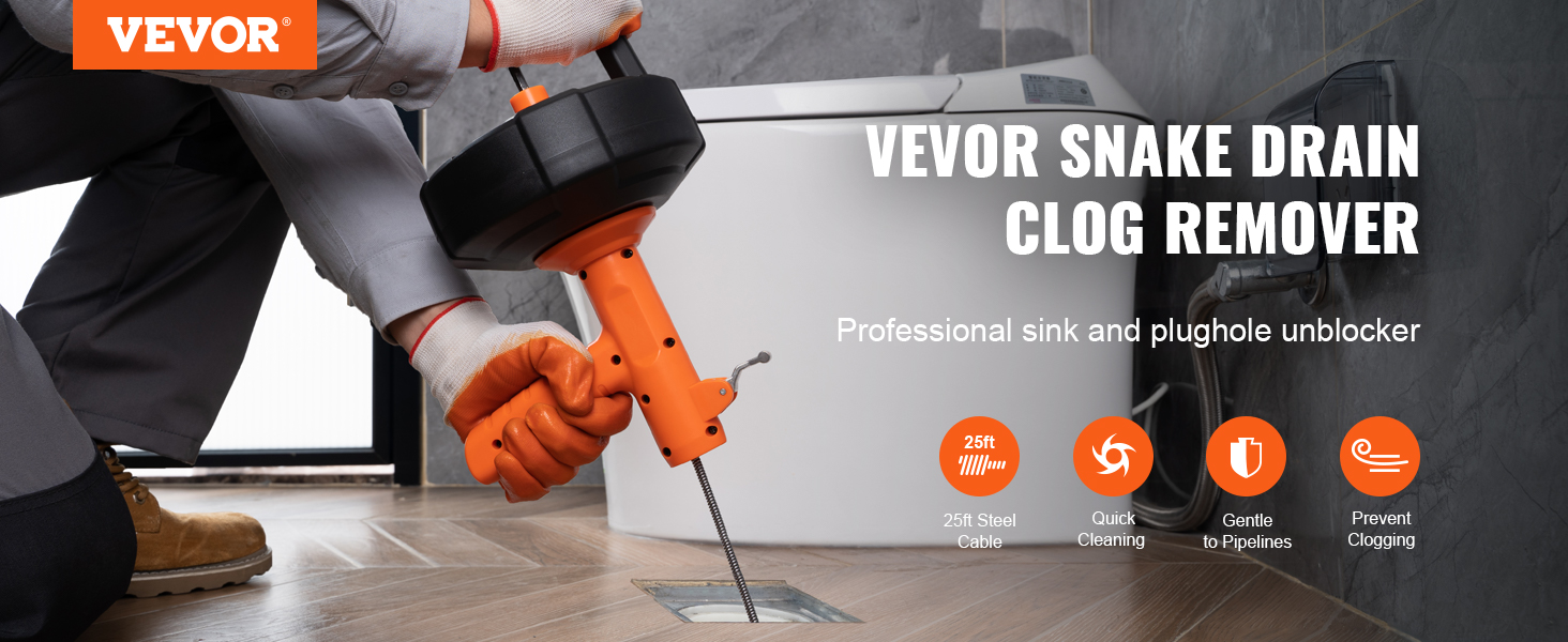 - Multifunctional Drain Cleaner: VEVOR handheld plumbing snake drain auger offers good versatility and cost effectiveness, quickly clearing debris from the most stubborn drains such as tea, peel, food residue, paper, bone, hair, and clothing unclogged in toilets, sewers, floor drains, sinks, pipelines, bathtubs.