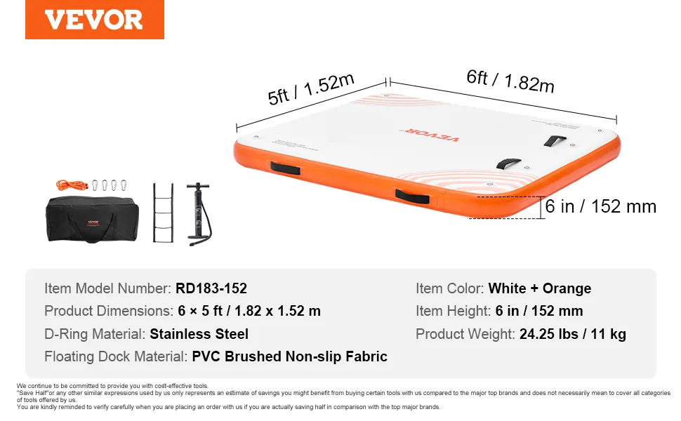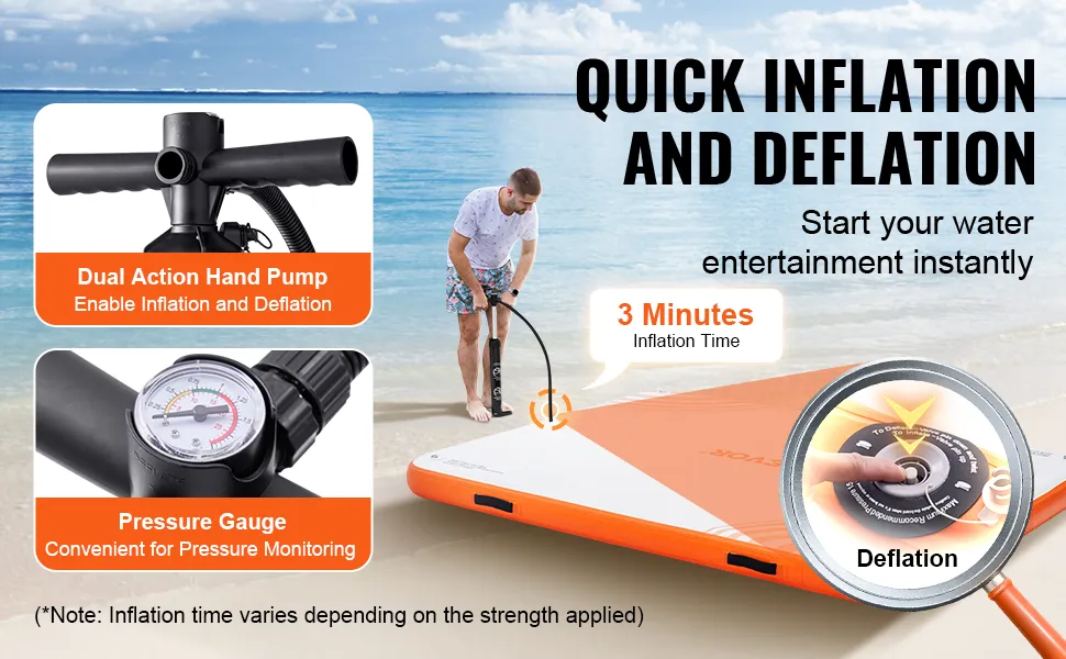 - Enjoy Pleasant Water Fun: Immerse yourself in water activities with VEVOR inflatable floating dock! Engineered from high-density 2700g/㎡ PVC brushed fabric, it offers a non-slip and durable surface for stability and safety. The included dual-action hand pump with pressure gauge ensures quick and effortless inflation and deflation, making setup a breeze for all.