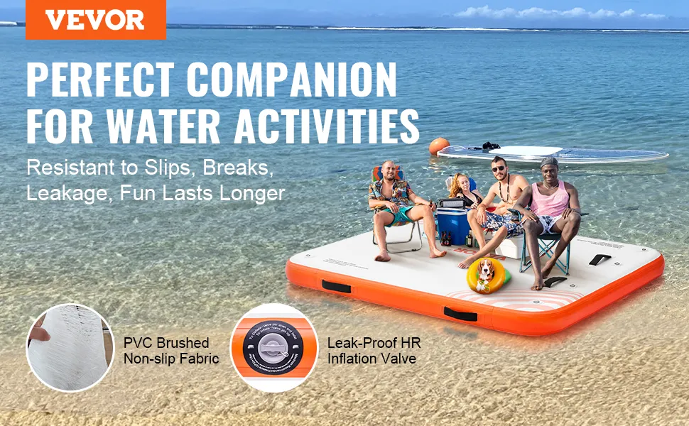 The non-slip surface of the VEVOR inflatable floating dock ensures safety. The dock's PVC-brushed fabric provides you with a secure footing. This feature is essential for preventing slips and falls. The non-slip surface makes it easier to stand and move on the dock. It's especially useful for younger kids and adults. The stable surface allows for various activities without worry. Safety is an important aspect of your water activities. Everyone can enjoy water fun safely, without the risk of accidents.