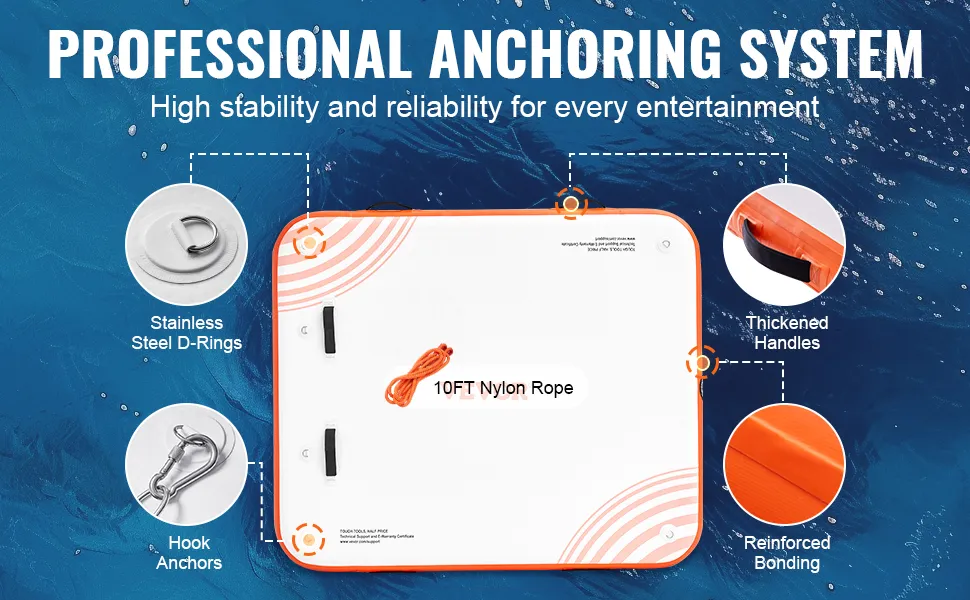 The VEVOR inflatable floating dock is built to last. It features durable PVC-brushed non-slip fabric and stainless steel D-rings, with the included anchor line and clips keeping the dock in place. This dock can withstand rough play and heavy use. With its strong construction, it's a reliable choice for any water adventure. Its durability ensures it will provide years of fun. Investing in this secure setup provides peace of mind while enjoying the water.