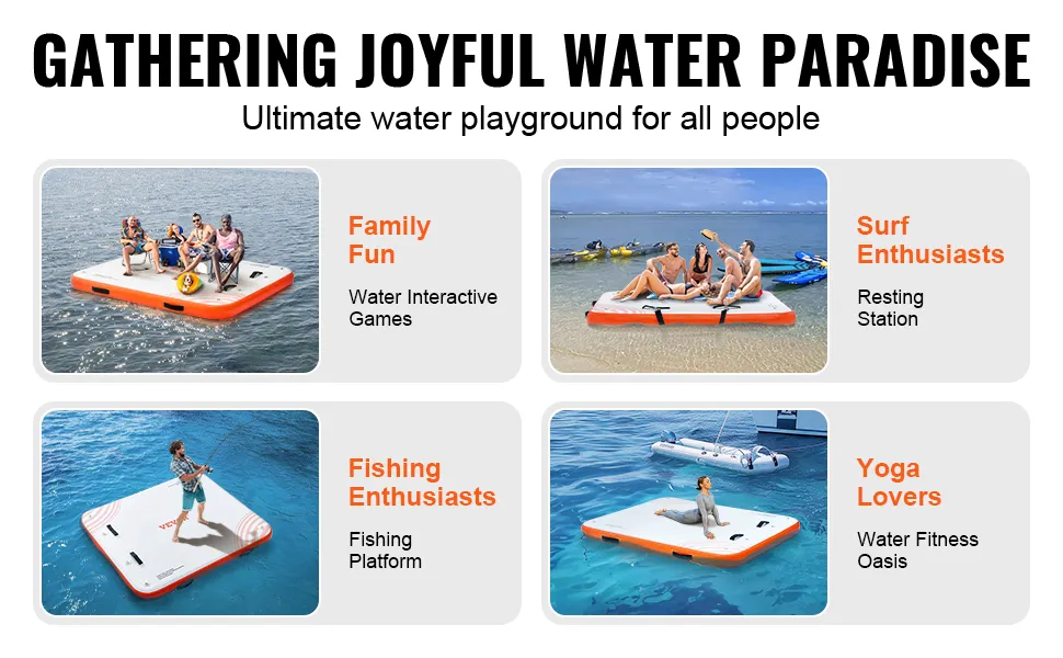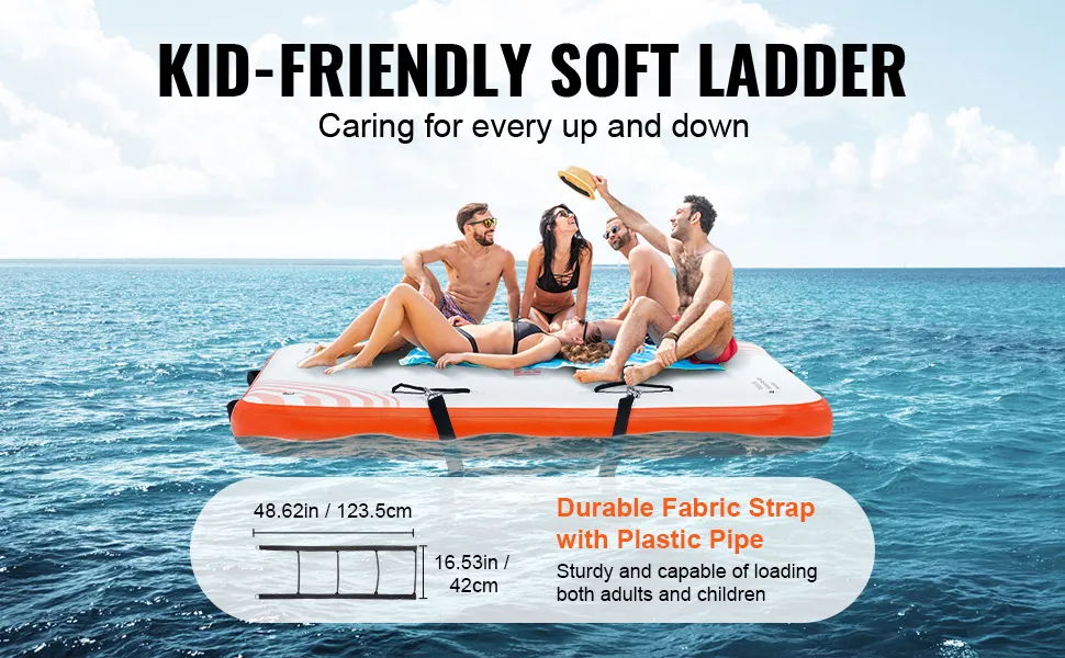The VEVOR inflatable floating dock is perfect for all ages. It offers hours of fun in the sun. This dock is simple to set up and includes a hand pump. You can easily set it up, making it convenient for any outing. The dock's size and portability make it an essential addition to your water adventure. With its included anchor line and clips, you can secure the dock without needing to do anything. Therefore, you can secure it effortlessly during your water adventures. The excellent design and features of the boat dock make it ideal for both kids and adults. These features make this dock a versatile and fun option for all water activities.