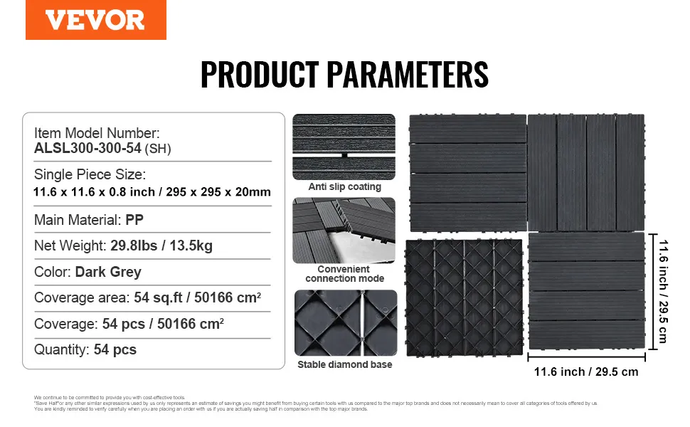 - 54 sq. ft. Coverage: Each set includes 56 tiles, measuring 11.6x11.6 inches, ideal for covering large outdoor patios, porches, poolside areas, or indoor showers and laundry rooms.