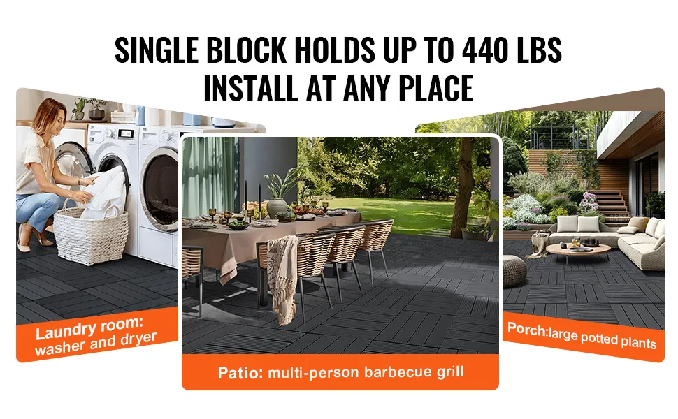 - 440 lbs Load Capacity: With a thickness of 0.8 inches, the patio tiles support up to 440 lbs, easily handling heavy items like trucks, bathtubs, sofas, washing machines, and grills.