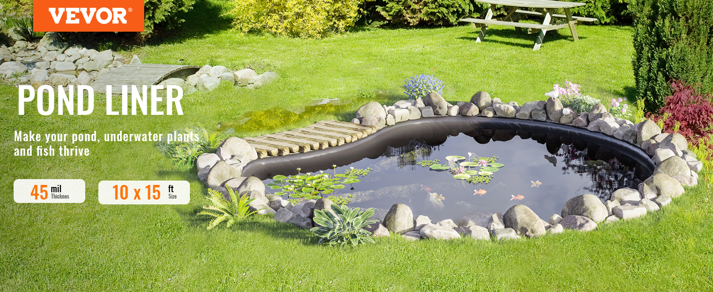 VEVOR Pond Liner, 10 x 15 ft 45 Mil Thickness, Pliable EPDM Material Pond Skins, Easy Cutting Underlayment for Fish or Koi Ponds, Water Features, Waterfall Base , Fountains, Water Gardens, Black